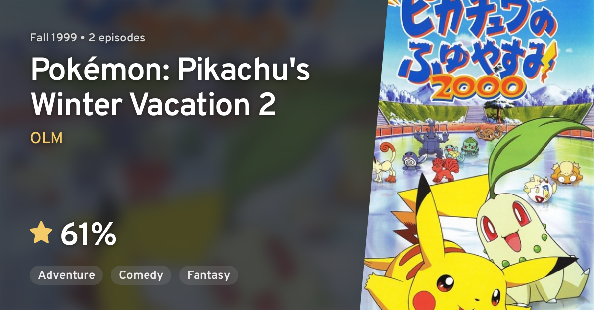 Pikachu's Winter Vacation - Pokémon: Pikachu's Winter Vacation 2000 (Anime) | aniSearch, We did not find results for:. Check spelling or type a new query. Maybe you would like to learn more about one of these? We did not find results for: